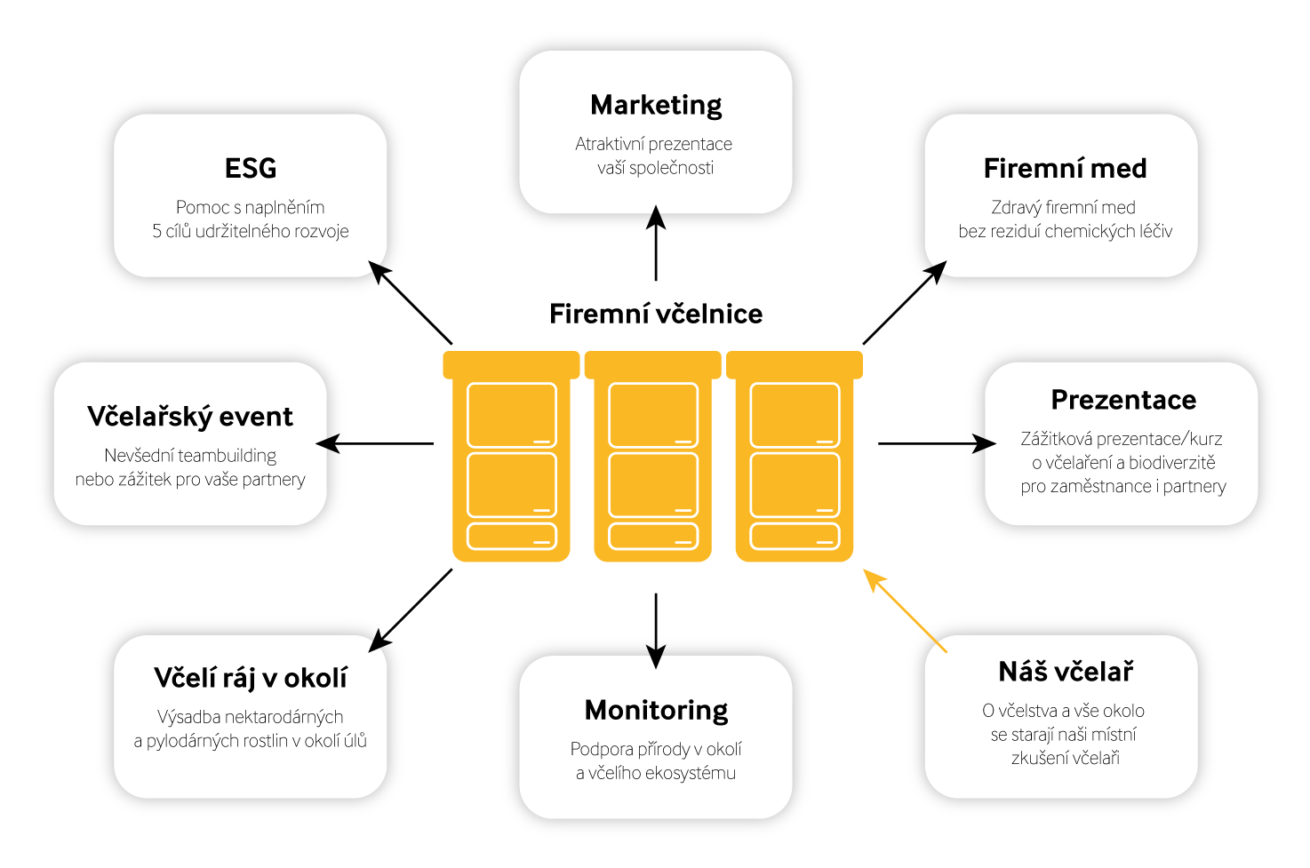Instalujeme a spravujeme včelnice, které posilují zdraví opylovačů, podporují udržitelnost a odliší vaši firmu od ostatních. Plně na klíč od péče o včely přes akce až po reporting ESG. Stačí říct a my se postaráme o zbytek.